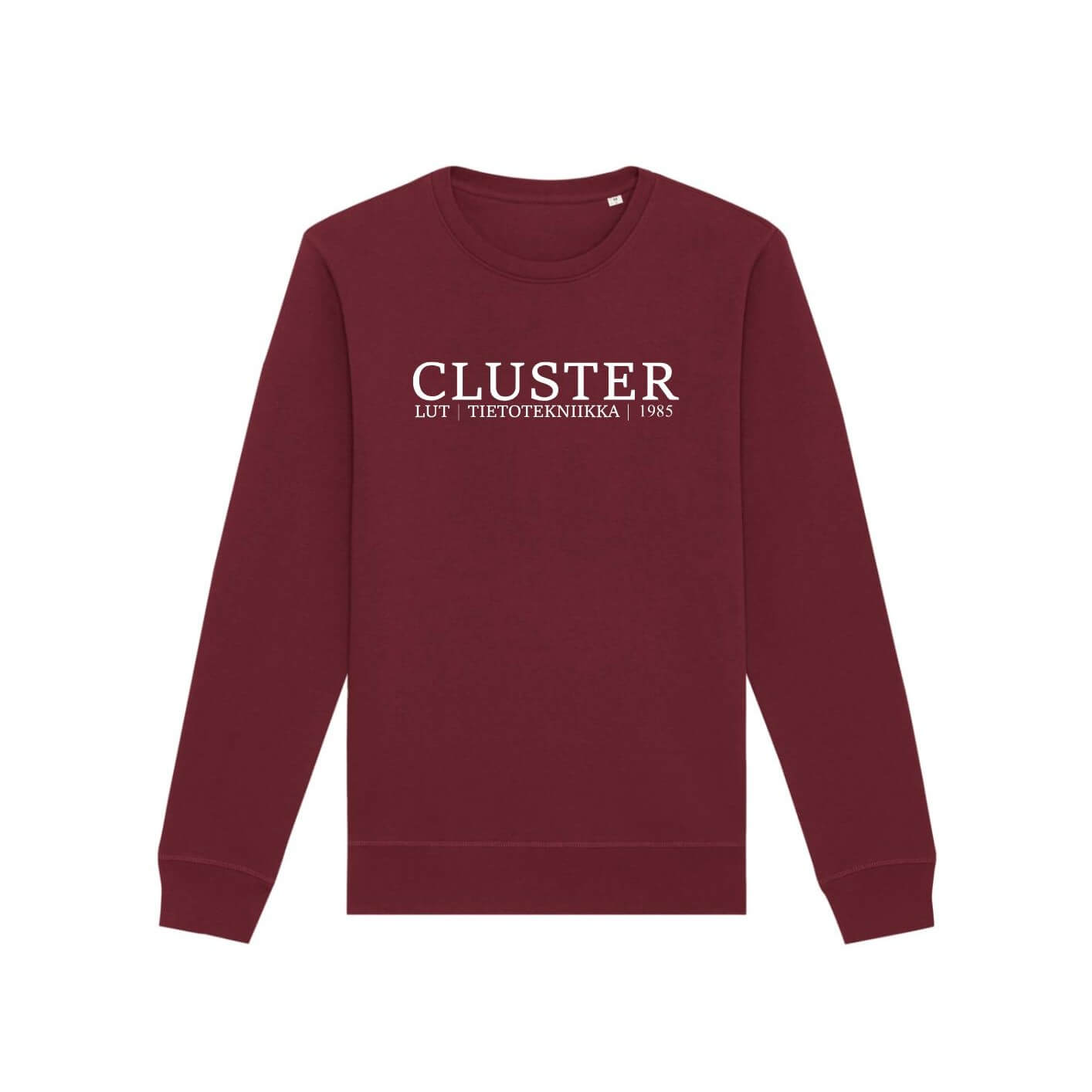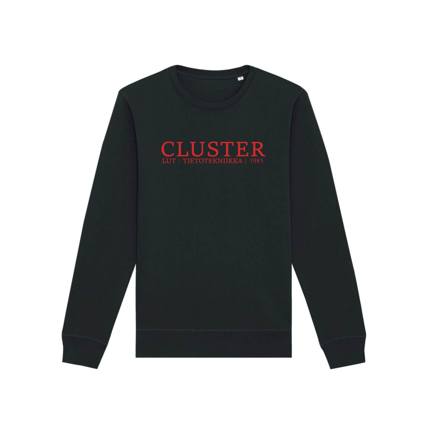 Tässä collegepaidassa yhdistyy sekä ekologisuus että mukavuus. Paidan rinnassa Cluster ry:n brodeerattu logo.
