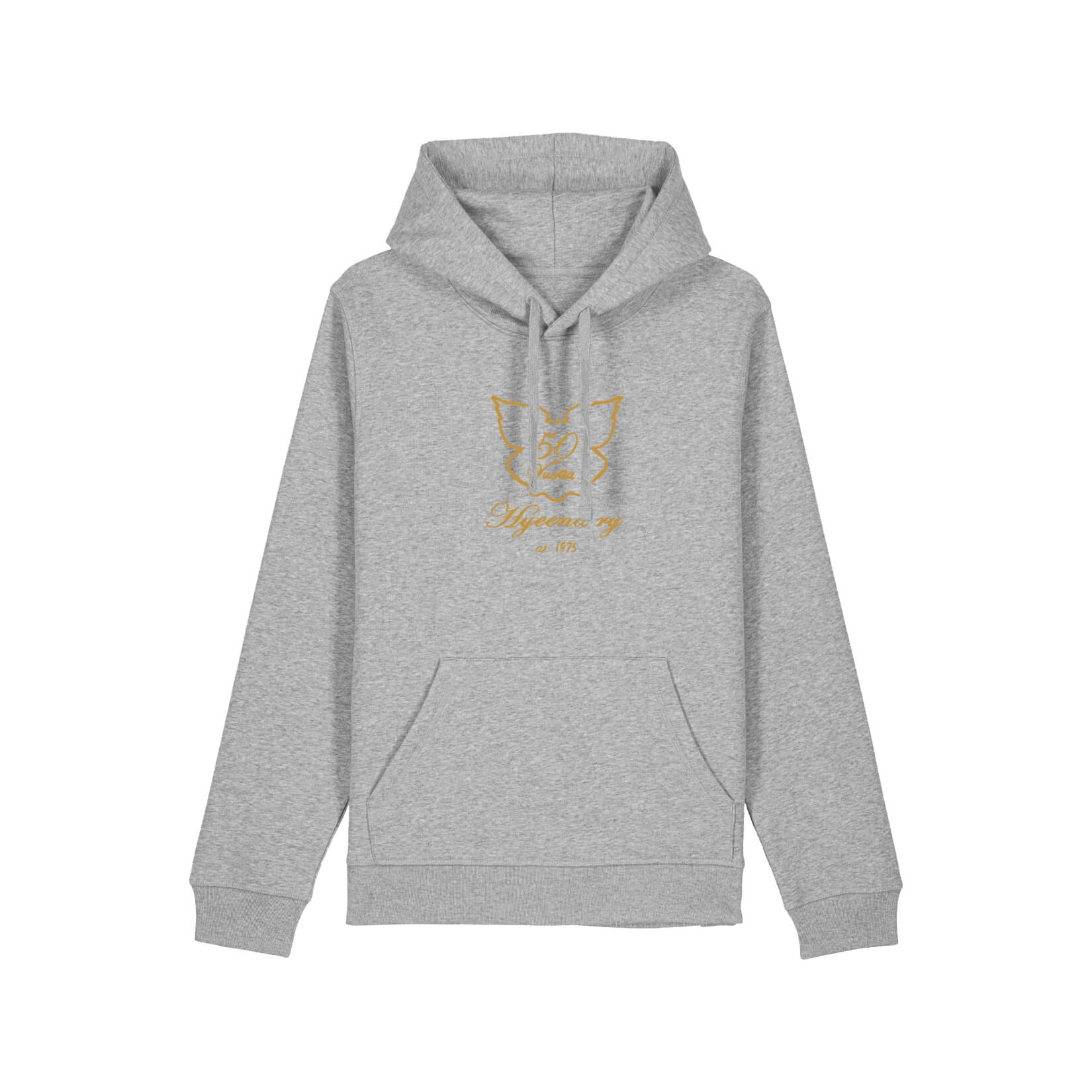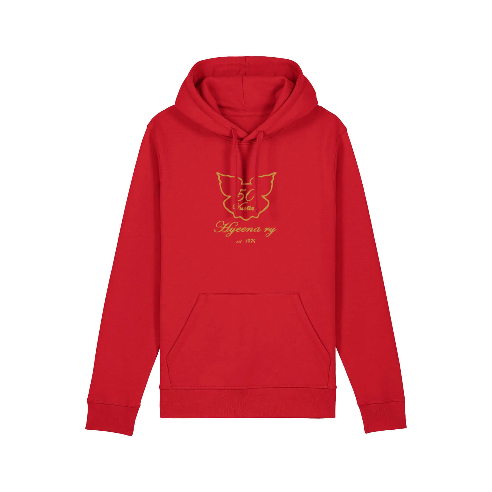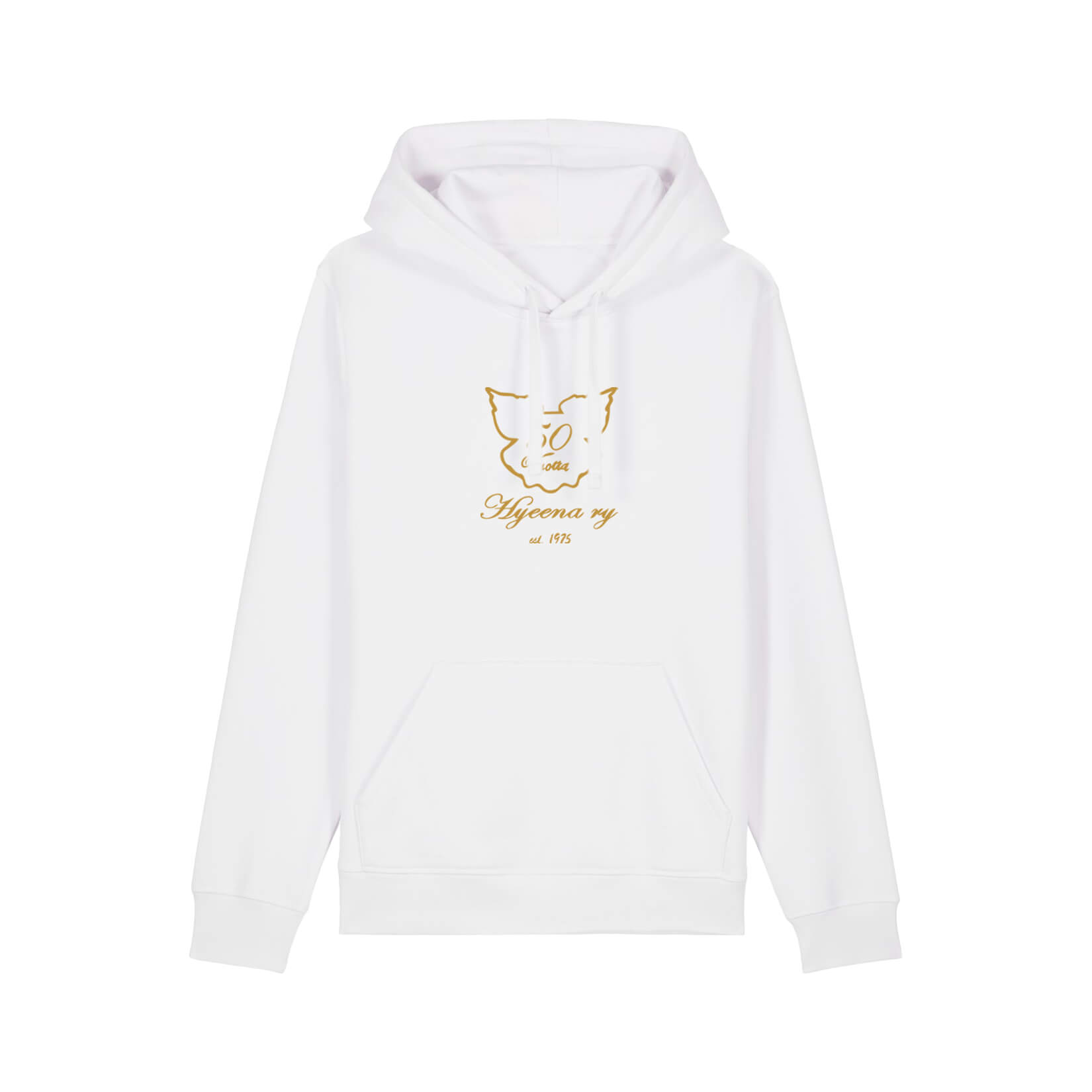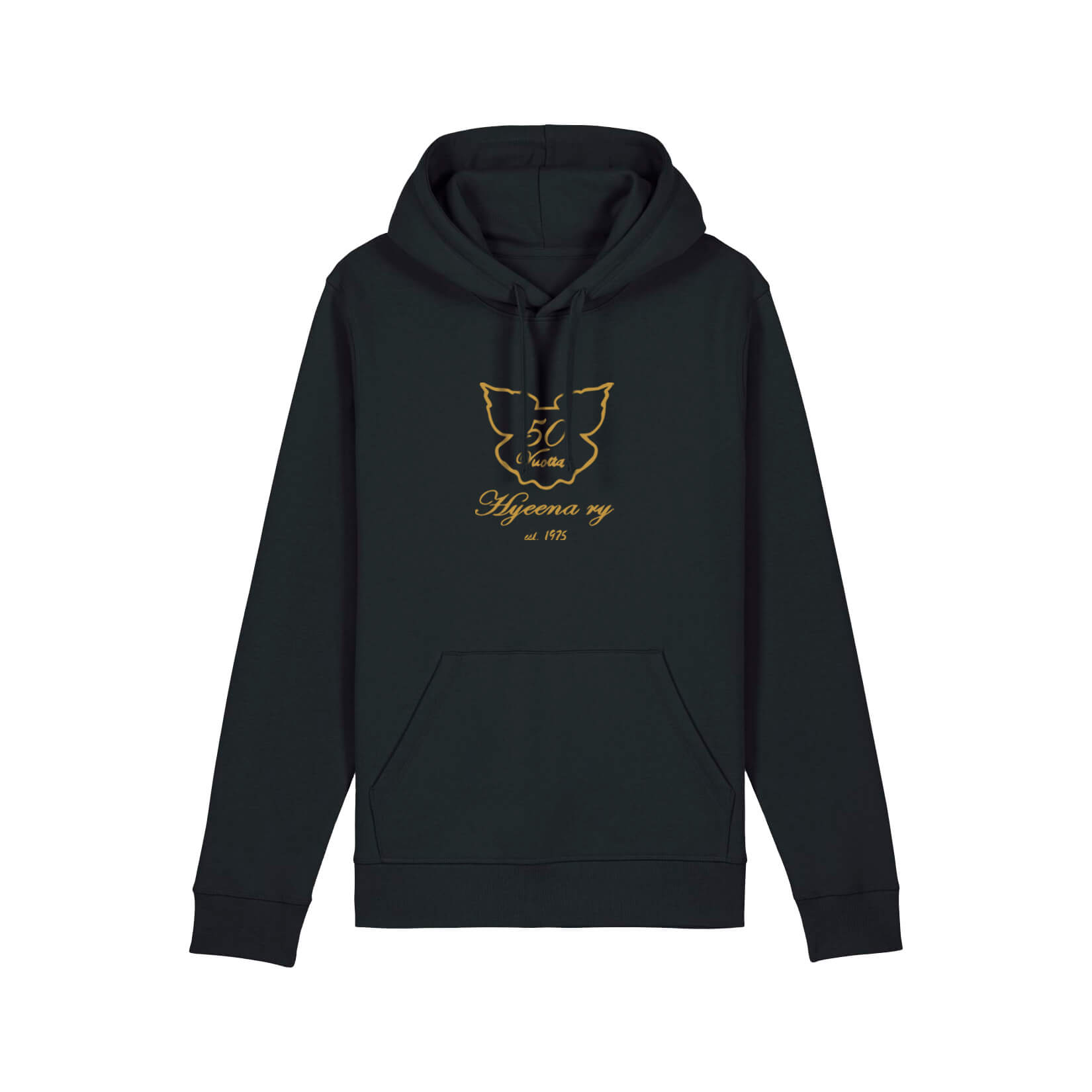 Ekologinen ja vastuullisesti valmistettu unisex huppari. Paidan rinnassa Hyeena ry:n 50v-juhlavuoden kunniaksi suunniteltu brodeerattu logo.