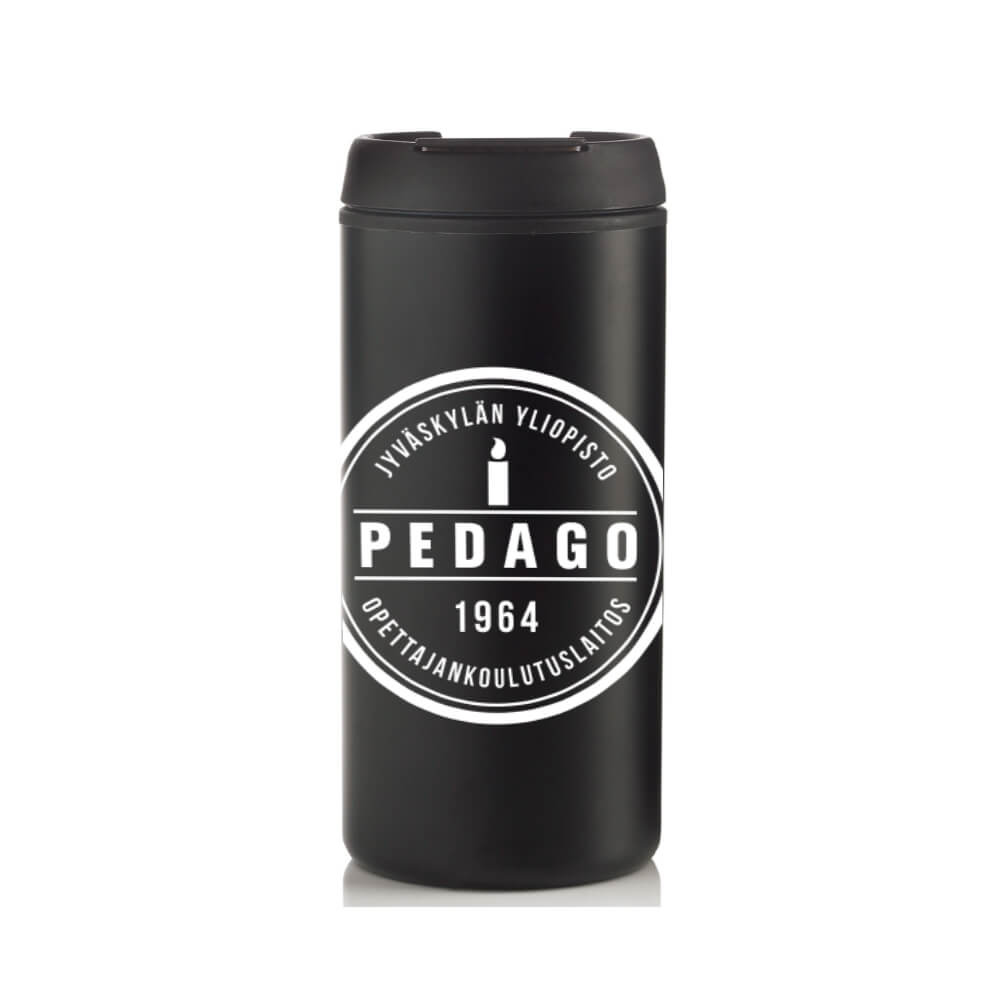 Kahvia tai teetä? – Kyllä kiitos! Nyt voit nauttia lempijuomaasi ekologisesti valmistetusta mukista. Tämä kahvimuki on nimittäin valmistettu kierrätetystä ruostumattomasta teräksestä. Tyylikkään loppusilauksen takaa Pedago ry:n logopainatus.