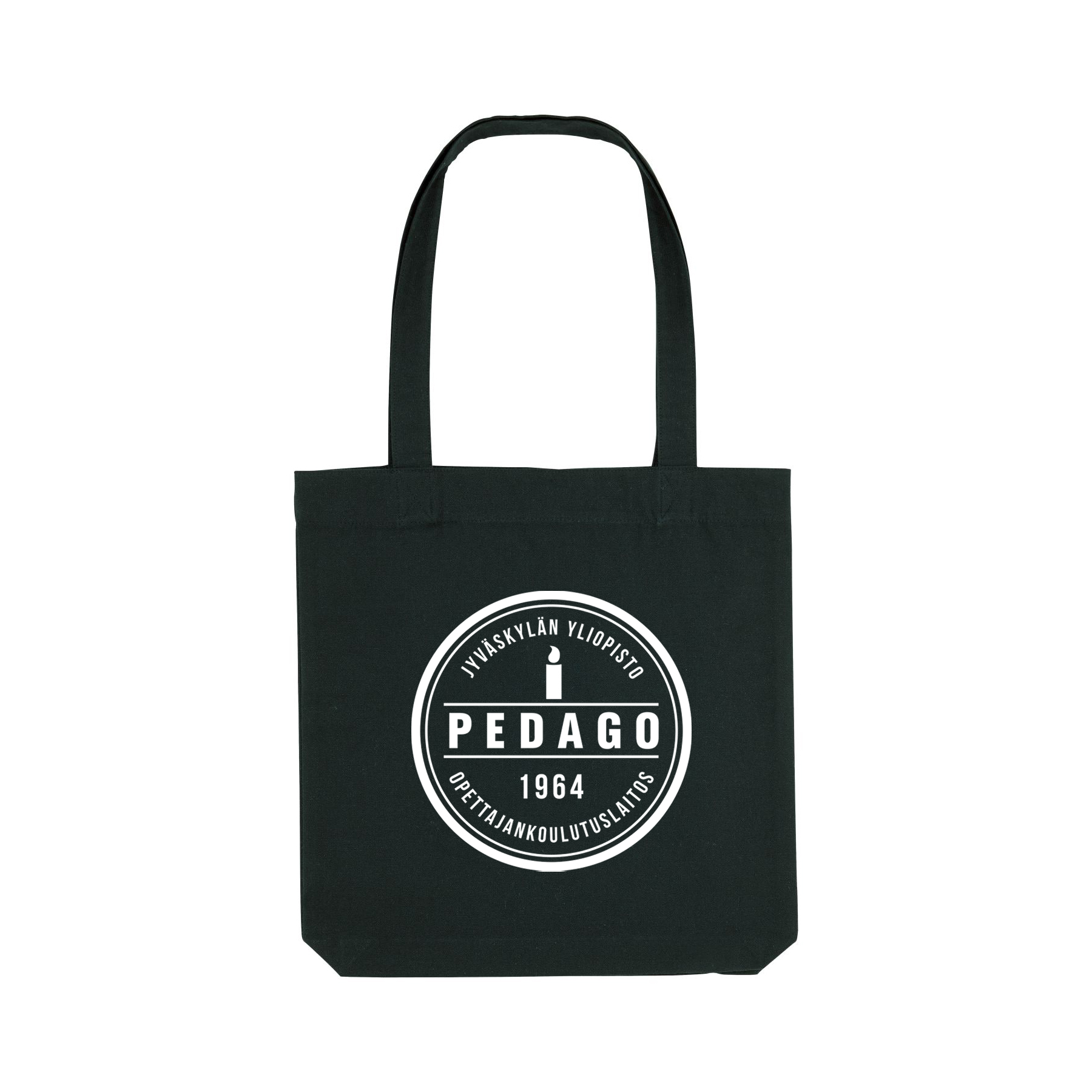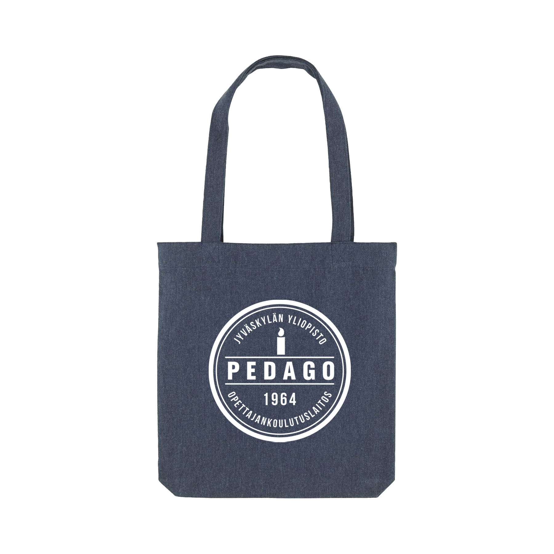 Perinteinen kangaskassi on kätevä niin kaupassa, koulussa kuin vapaa-ajallakin. Tämä kangaskassi on valmistettu vastuullisesti kokonaan kierrätysmateriaaleista ja sen toisella puolella on Pedago ry:n painatettu logo.